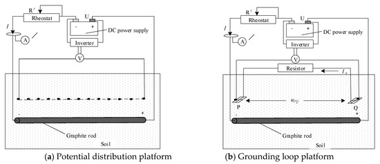 The ground potential distribution caused by the operation of the subway is an important basis for the calculation of the ground loop current. In this chapter, an experimental platform is set up to simulate the ground potential distribution near the subway and the neutral point currents of transformers. The schematic diagram of the experimental platform is shown in Figure 15. A graphite rod is selected to simulate a steel rail coated with insulating paint. Iron wire meshes are used to simulate ground grids near the subway. A fixed resistor is used to simulate the neutral point resistance. A copper interconnect with little resistance is used to connect the graphite rod with DC power supply. Rheostat is in series to protect the circuit. A large-capacity lithium polymer power supply is used as a DC power supply to power the loop. The physical map of the experimental platform is shown in Figure 16. Without high voltage and large current, the experiment platform is simple and convenient to operate.