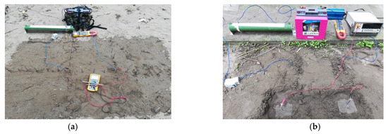 Field experiment. (a) Field test of earth potential; (b) Field test of ground loop current.