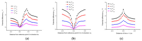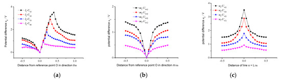 Potential distribution curves. (a) Distance from reference point O in direction l; (b) Distance from reference point O in direction m; (c) Distance from the line x = L.