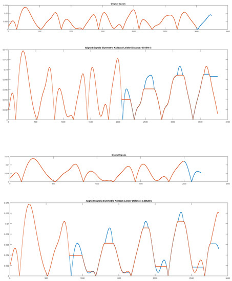Therefore, to characterize the level of similarity of two signals or patterns using the DTW technique, it is necessary to define a suitable metric. Among the possible adoptable, the symmetric Kullback–Leibler (SKL) metric (see Equation (4)) was proposed because, in our tests, it showed better performance than the classic Euclidean or absolute. More details about DTW and SKL metric are available in [19,20].