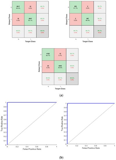 (a) The confusion matrixes (over the synthetic PPG composed by subject signal and reference signal) related to some recruited subjects. The proposed pipeline is able to discriminate with 99.6% to 99.7% accuracy the correct car-driver identity (Class 1, subject and Class 0, PPG reference of RD-M); (b) The ROC curves of some further tested subjects are reported.