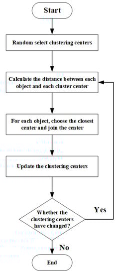 The k-means algorithm is a classic clustering algorithm. Generally, Euclidean distance is used as an evaluation index of the similarity of two samples. The basic idea is as follows: the data are divided into K groups in advance, then K objects are randomly selected as the initial cluster center. Then the distance between each object and each cluster center is calculated and each object is assigned to the cluster center closest to it. The cluster centers and the objects assigned to them represent a cluster. For each sample assigned, the clustering center of the cluster is recalculated based on the existing objects in the cluster. This process is repeated until a certain termination condition is met. The termination condition may be that no objects are reassigned to different clusters, no cluster centers change again and the squared error and local minimum. The flowchart of k-means algorithm is shown in Figure 1.