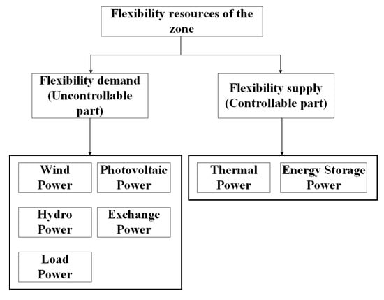 The flexibility resources diagram of the zone is shown in Figure 4. In the zone, flexibility resources are divided into two parts: flexibility demand and flexibility supply. Flexibility demand is generated from uncontrollable parts, such as wind power, hydro power, photovoltaic power, exchange power and load power. Flexibility supply is generated from controllable parts such as thermal power and energy storage power.