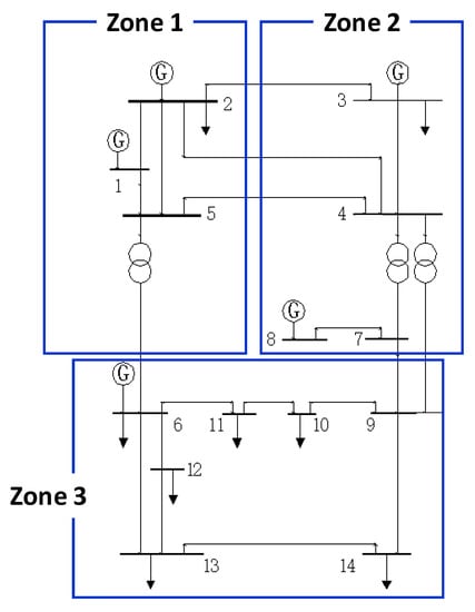 In order to verify the effectiveness of the methodology proposed in this paper, a modified IEEE 39-node system was also used to evaluate the flexibility. The zone figure is as Figure 13. The renewable power sources configuration is as Table 6. The trends of the power sources and loads were consistent with 14-nodes case above, but the installed capacity of power sources has been expanded.