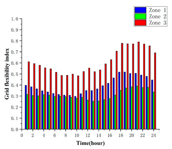 Take Zone 1 as an example—it can be seen from Figure 12 that the flexibility indices of two methods were relatively close. Although not all indices were close at each moment, the overall trend was consistent. The comprehensive flexibility evaluation indices obtained based on the clustering scenario can accurately reflect the system′s flexibility in a certain period of time. Therefore, the typical scenario generation method proposed in this paper can greatly reduce the calculation time and improve the efficiency of flexibility evaluation without affecting the accuracy of the evaluation results.
