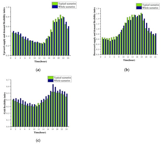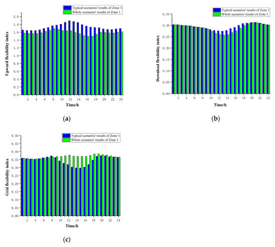 Using Zone 1 as an example, the results are as Figure 14. It can be seen from Figure 14a,b that the upward supply and demand flexibility indices of Zone 1 were larger than 1 and relatively, the downward supply and demand flexibility indices of Zone 1 were lower than 1, indicating that in the future, more flexible resources such as thermal power and energy storage systems need to be configured in Zone 1 to increase the upward adjustment ability. And from Figure 14c, it can be seen that the grid flexibility indices of Zone 1 were lower than 1, which means that the transmission lines in Zone 1 were in normal operating state, and there was almost no line overload. The maximum transmission capacity of the lines in the zone can meet the power flow distribution. From these three figures, the results obtaining by the typical scenarios proposed in this paper and the results obtaining by the whole scenarios were relatively close, and the overall trend was consistent. Therefore, the results of the IEEE 14-node case and IEEE 39-node case support that the method proposed in this paper can effectively reflects the flexibility status of the power system and improve the efficiency of flexibility evaluation.