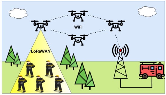 The mobility of firefighters represents a big challenge, since the UAV swarm has to maintain both area coverage and end-to-end connectivity to the Base Station (BS) of the command post. LoRaUAV, an UAV system based on LoRaWAN and Wireless Fidelity (WiFi), is designed to tackle these problems. Figure 1 shows a representation of the system architecture.