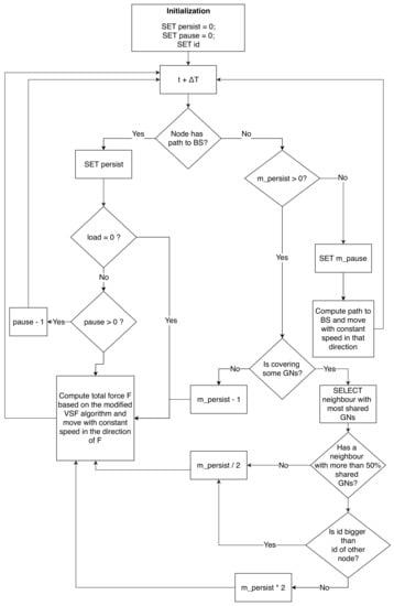 UAVs connecting more GNs oppose more resistance to movements that might reduce the number of covered nodes. At each time step , the resulting force is computed for each UAV and then, if the force magnitude is above a certain threshold, the UAV moves with constant speed in the new direction. An exploration phase is also triggered each seconds. All UAVs with no other UAV in their visibility zone become scout nodes with probability and an attractive spring force is computed between them and the center of the least visited cell. In [], the authors perform a comparison with a centralized optimization scheme, which concludes that the distributed algorithm can achieve a performance that is similar to the centralized one.
