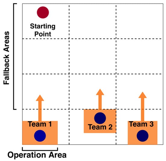 where is the retreat distance of team j. At this point, every team has an assigned vertical stripe with cells. At , each team selects a random point in the furthest cell from the origin of the scenario in its assigned stripe and moves towards it with constant speed until the destination is reached. At this point, the team members start moving independently and randomly for a certain amount of time (deterministic or random) in a rectangular operation area. When time is over, teams select a new point in the second furthest cell and repeat the previously described process. Teams stop moving when the simulation is over or when they have visited all the cells in their column. This model tries to mimic the progress of a wildfire and the consequent retreat of firefighters to fallback areas where new attacks to the fire are attempted. A representation of the model is shown in Figure 3.