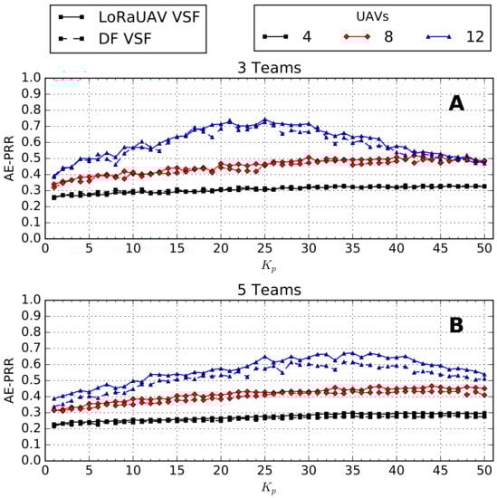 A comparison between the LoRaUAV VSF algorithm (see Section 3.2) without extensions, and the VSF algorithm described by Di Felice et al. [] (DF algorithm) has been performed. Before starting the analysis, it must be clarified that the parameter coincides with the proportionality factor of in the LoRaUAV VSF algorithm and it coincides, instead, with itself in the DF VSF algorithm. An AE-PRR comparison between the two algorithms is shown in Figure 4 for a scenario with three and five teams of GNs. For clarity, the confidence interval is not shown. It is possible to notice that the AE-PRR of both algorithms follows approximately the same trend for all configurations, presenting the same regions of increase and decrease and the same range of optimal values. However, the AE-PRR produced by the LoRaUAV VSF algorithm seems slightly better than the one generated by the DF VSF algorithm for most values. To verify this hypothesis, the curves generated by the two algorithms have been compared by computing the point by point euclidean distance between them for each configuration. On average, LoRaUAV produces an AE-PRR increment which lies between 0.03% and 4.6% independently of the value of that is used. The developed VSF algorithm produces more benefits when a large number of teams is deployed (e.g., five teams). However, for most values, improvements fall inside the confidence interval of the DF VSF algorithm. It is therefore not possible to assert that the LoRaUAV VSF algorithm performs better in general. In fact, changing just the weights of the forces is not by itself sufficient to achieve a significant AE-PRR increase. Nevertheless, even if small and limited to particular configurations, the improvements introduced by the developed algorithm come at no significant additional cost, apart from a delay penalty affecting some packets and correlated with the higher PRR. As such, at this stage, basic LoRaUAV becomes at least validated in comparison with DF. Further comparison regarding the frequency and duration of disconnection times is provided in Section 5.4.