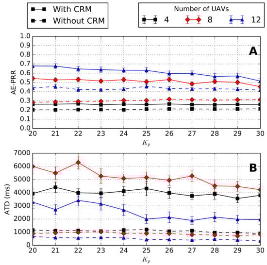 AE-PRR (A) and Average Total Delay (ATD) (B) comparison when the CRM algorithm is activated in a scenario with three teams of 20 GNs.
