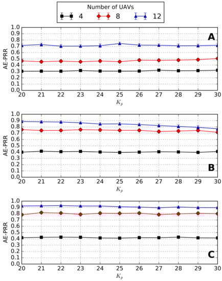 The MP algorithm represents the last attempt of the system to recover a connection between the aerial mesh and the GNs that went out of range. For this reason, the PRR is used as the main evaluation metric. In order to increase the triggering chances of the MP algorithm, the firefighters mobility has been extended to support the splitting of teams. With this modification, a team can be configured to split in half during the simulation, so that an UAV that is covering alone a team of GNs is forced to create at least one hologram when half of the team eventually goes out of range. Given this modification, it is of particular interest to observe the behavior of the MP algorithm in two situations: a more conventional setting, where team splitting is not active, and in a more challenging setting where teams can split. The end-to-end PRR is collected individually for all the 100 runs of the same scenario and a direct comparison between corresponding runs of different scenarios is performed. The results of the comparison are reported in Table 3, considering three teams and 2500 m of area side and 3000 s of simulation time. The first observation is that the MP algorithm is not always beneficial to the system. In fact, a relevant number of runs shows a PRR that is, on average, even lower than the one achieved without the MP algorithm. The loss is more marked in scenarios in which teams do not split. This is caused by the fact that the strategy of recovering the connectivity with lost GNs is not always beneficial to the UAV formation since it does not follow any global optimality criteria. However, the simultaneous activation of the MP and CRM algorithms is beneficial in most of the situations. In fact, the average PRR undergoes a considerable increment in at least of the runs when teams do not split and of the runs when teams split. In some cases, the gain that is obtained is more than double of the loss observed in analogous scenarios without MP algorithm. When reverting to the default simulation parameters, the activation of the MP algorithm and of the CRM algorithm produces the results shown in Figure 6C. Even if small, the improvements allow to achieve AE-PRR levels above with 12 UAVs and between and with 8 or 10 UAVs. Similar tests have been run for the VSF+MP configuration with no noticeable advantages.