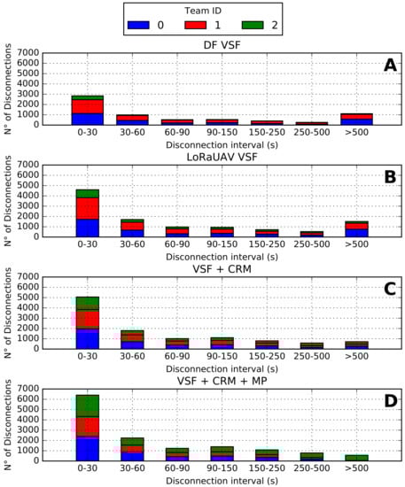Frequency and duration of disconnections for DF VSF (A), LoRaUAV VSF (B), LoRaUAV VSF+CRM (C) and LoRaUAV VSF+CRM+MP (D).