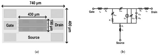 Figure 1 shows the layout of the two-finger GaN-HMET in (a) and its equivalent circuit in (b). The equivalent circuit consists of non-linear components (, , and ), linear parasitic components (, , , , , and ), and the nonlinear current source () [,]. Furthermore, in order to model the substrate effect, a series R-C network ( and ) is added []. Extraction of the parameters must be accurate in a wide frequency and operational range in both the voltage and current.