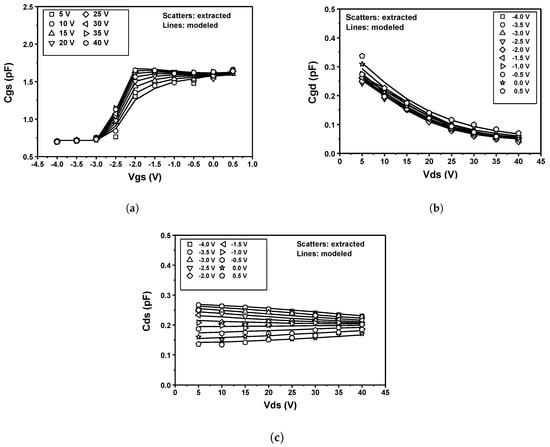 Linear parasitic components were extracted prior to the extraction of the nonlinear components. A multi-point simultaneous optimization technique was adopted []. The non-linear components of the GaN-HEMT should be accurately modeled for a wide operating range in terms of both current and voltage. Non-linear components of the unit GaN-HEMT included the gate-source capacitor (), gate-drain capacitor (), and drain-source capacitor () [,,]. Each component was extracted based on the measured S-parameter of a wide operation range, and based on the extracted data, the nonlinear capacitors were empirically modeled using continuous and differentiable functions [,,,,,,]. The modeled non-linear components are expressed as follows: