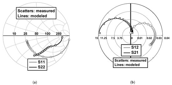Measured and modeled S-parameters of the two-finger GaN-HEMT for Vgs of −2.0 V and VDDof 30 V in the frequency range from 0.1 to 10 GHz: (a) S11 and S22; (b) S12 and S21.