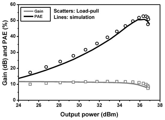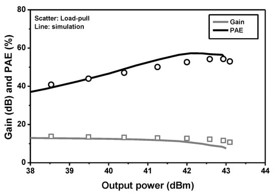 The unit GaN-HEMT large-signal model was verified using the measured S-parameters and the load-pull measurements. Figure 4 presents the measured and modeled S-parameters in the frequency range from 0.1 to 10 GHz for gate bias voltage (Vgs) of −2.0 V and drain bias voltage (VDD) of 30 V for the large-signal of the unit GaN-HEMT. This was a Class-AB condition with a quiescent current of 15 mA. The measured and modeled results were consistent with each other. Figure 5 presents the load-pull measurement and simulation results at a frequency of 3.5 GHz using the two-finger GaN-HEMT large-signal model. The simulated GaN-HEMT produced a gain of 12.1 dB, a peak output power of 36.3 dBm, and a maximum efficiency of 57.7%. The load-pull measurement showed nearly similar results with a gain of 12.2 dB, a peak output power of 36.0 dBm, and a power added efficiency (PAE) of 55.4%.
