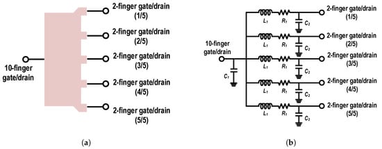 Figure 7a shows the layout of the gate or drain pad of the 10-finger GaN-HEMT for the EM simulation. Figure 7b shows its equivalent circuit. Five units of two-finger GaN-HEMTs were combined into one pad. The equivalent circuit consisted of shunt capacitors and a multiple series inductor and resistor for the pad. Keysight’s ADS Momentum, a 2.5D EM simulation tool, was used to simulate the layout of the pad.