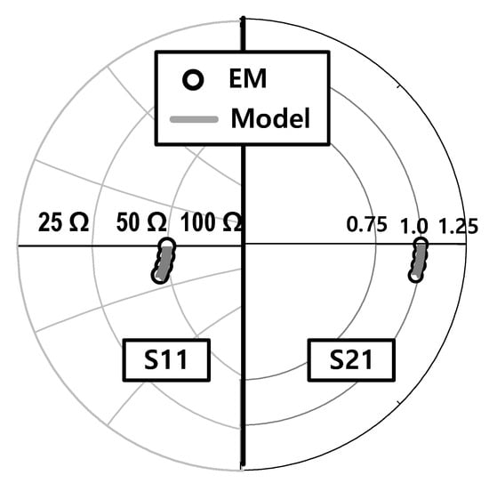 Figure 8 presents the comparison between the EM simulation results and the circuit simulation results of the equivalent circuit. The results of the EM and circuit simulation were matched with each other through a wide frequency range from 0.1 to 10 GHz. The extracted component values of the equivalent circuit were as follows: of 53.8 fF, of 11.1 fF, of 18.6 pH, and of 3 mΩ. Figure 9 presents the overall equivalent circuit of the 10-finger GaN-HEMT using a combination of five-unit devices and equivalent circuits of the pads.