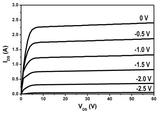 Figure 2 shows the measured and modeled PIV of the unit two-finger GaN-HEMT. The gate voltage (Vgs) range of the measured and modeled PIV data was from −2.5 V to 0 V, while the drain voltage (Vds) range was from 0 to 60 V. According to the extracted parameters in Table 1, the modeled and measured PIV were consistent.