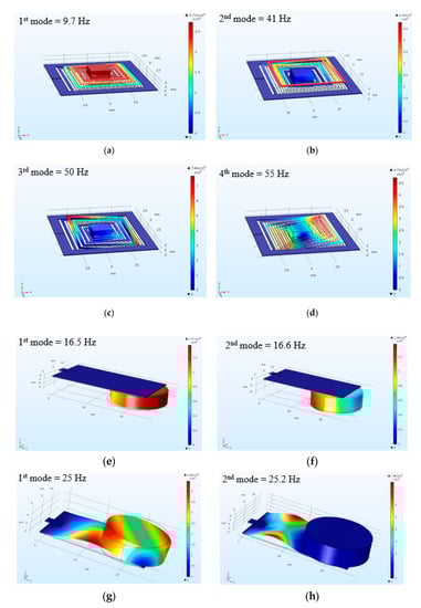 The HIEH proposed in this work is a resonant-type multi-mode (http://bit.ly/3cN2tbx) system, with peak output power at different resonant frequencies. The Eigen frequency modal analysis conducted in COMSOL Multiphysics® software is shown in Figure 2. The suspended square planar spring was designed holding desk magnets at the center and fixed constraints were applied to the spring at outer edges. The magnets were united with the spring and the model was meshed to compute for the Eigenfrequencies. The resonant frequencies of the HIEH are obtained at 9.6 Hz (1st mode), 41 Hz (2nd mode), 51 Hz (3rd mode) and 55 Hz (4th mode). In the first mode, the central platform of the spring holding magnetic masses and the adjacent solid rings were moving at maximum amplitude, as shown in Figure 2a. At 41 Hz, the 4th and 5th rings in the square moved at maximum displacement, Figure 2b. The displacement shifted towards the corner of the spring at higher frequencies of 50 Hz and 55 Hz, as depicted in Figure 2c,d, respectively. However, the upper PVDF, Figure 2e,f, and lower PVDF, Figure 2g,h cantilever beams holding wound coils resonate at 16.5 Hz and 25 Hz respectively, and produced peak output across the upper and lower coil. The PVDF beams, due to the tip mass of the wound coils and the gap between coils and magnets (4 mm), do not interact with the magnets.