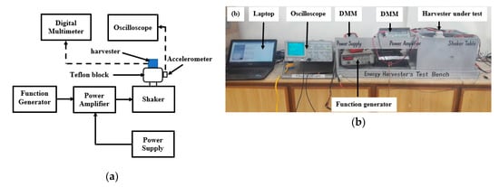 The output performance of the HIEH was tested inside the laboratory, using the experimental setup: a schematic diagram is depicted in Figure 6a and the developed experimental setup is shown in Figure 6b. The harvester was firmly fixed on the vibration shaker’s table, with the shaker used to generate sinusoidal input excitations of varying acceleration intensities from 0.1 g to 0.6 g, and frequency from 1 Hz to 115 Hz. A 3-axis accelerometer (Model: EVALADXL335Z, Norwood U.S.A) was attached to the shaker’s table, to record the different base acceleration levels of input frequency signals coming from the function generator (Model: GFG 8020H, GW Instek, New Taipei, Taiwan). A 12 V, DC power supply (Model: GT-41132, GlobTek, Inc., Japan) was used to supply power to the amplifier (Model RM–AT2900, Rock Mars, United Arab Emirates), which magnifies and regulates signals to the vibration shaker, in order to excite the harvester. Moreover, a digital oscilloscope (Model: GDS-2204A, GW Instek, New Taipei, Taiwan) and digital multimeters (DMM) (Model: UT81A/B, Uni-Trend Technology, China) were used to measure and analyze output signals from the accelerometer and the harvester, respectively.