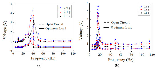 The HIEH was characterized inside the laboratory under sinusoidal input excitation for a frequency sweep (1–115 Hz) of varying acceleration amplitudes from 0.1 to 0.6 g. Notably, Figure 7a,b show the output voltage of the upper and lower hybrid generators for varying frequencies at 0.1g, 0.4 g, and 0.6 g acceleration levels. The device operates in a wide operating frequency of 45 Hz, and exhibits multi-resonant states, corresponding to the resonant frequencies of the intermediate square spiral spring, the upper, and lower cantilever beams under forward frequency sweep. The spiral spring responds to as low-frequency oscillations as 5 Hz, and resonates at 9.7 Hz, producing the highest no-load voltage of 1.41 V across the lower hybrid generator under 0.6 g base acceleration, as illustrated in Figure 7a. Moreover, the square spiral spring excites at 41 Hz, 50 Hz and 55 Hz, producing second and third peak voltages of 4.55 V and 1.8 V, respectively, at the second and third mode of vibration. Furthermore, the lower PVDF cantilever resonates at 25 Hz and produces an open-circuit voltage of 1.71 V under 0.6 g base acceleration across the lower hybrid harvester. The upper PVDF cantilever excites at 16.5 Hz and delivered maximum open-circuit voltage of 5.64 V across the upper hybrid generator under 0.6 g, as depicted in Figure 7b. The upper and lower hybrid generators are also tested across matching impedances (optimum loads), under different acceleration levels and input frequencies, as represented by the solid lines in Figure 7a,b. The peak voltage levels of 1.55 V and 1.71 V under 0.6 g are delivered to the optimum resistances. The vibration amplitude decreases with an increase in system damping, and the total power is not merely sum of the piezoelectric and electromagnetic power, but rather a function of the total damping.
