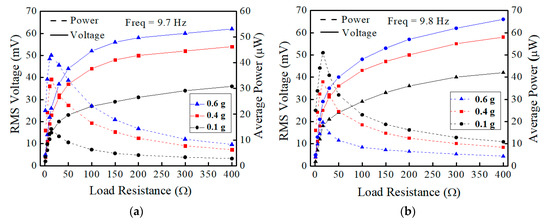 Figure 8a,b show the variation of RMS voltage and average power levels as a function of different load resistances, between 5 Ω and 400 Ω, connected across coil-I and coil-II, respectively. The HIEH is kept oscillating at first resonant frequency of 9.7 Hz and is subjected to different base accelerations. The behavior of the upper and lower electromagnetic generators is identical, but with peak voltages at different base accelerations, as depicted in Figure 8. With increasing load across the upper and lower EM generators, output RMS voltage initially increases considerably before becoming gradually flattered at relatively higher loads. Average power, however, increases until it reaches the highest value at the optimum load (13.5 Ω for coil-I and 16.5 Ω for coil-II), before decreasing exponentially. With the average power obtained from RMS voltage [64]; using equation , maximum powers are delivered across both coils, with load resistances equal to the coil’s internal resistance, which satisfies maximum power transfer [65].