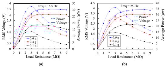 Figure 9a,b indicate the dependence of load voltage and load power on load resistance values across PVDF terminals. Under 3 MΩ load resistance, PVDF-I and PVDF-II show the highest average power when excited at resonant frequencies of 16.5 and 25 Hz, respectively. RMS voltage and average power increase with increasing amplitude of base acceleration, as depicted in Figure 9a, and highest load voltage of 3.4 V, was obtained across PVDF-I at 16.5 Hz, under 0.6 g at a loading resistance of 9 M Ω. As demonstrated in Figure 9b, the RMS voltage and average power increase with an increase in base acceleration and the peak power reaches 36.3 µW across 3 MΩ load resistance, at resonant frequency of 25 Hz of the lower cantilever beam.