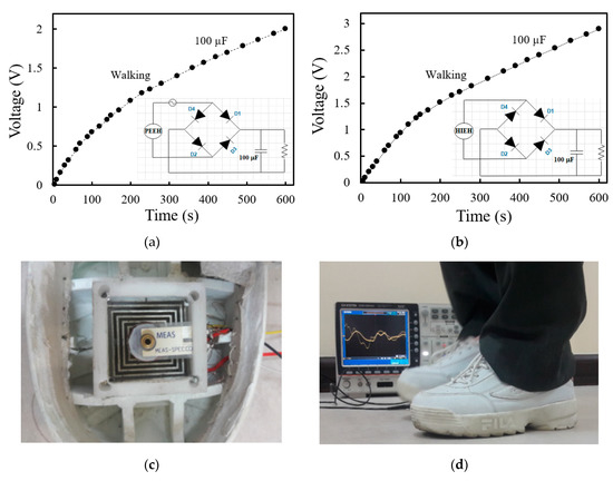(a) Voltage curve showing 100 µF capacitor, charged by the piezoelectric part of the harvester. (b) A capacitor charged by the hybrid piezoelectric and electromagnetic harvester. (c) Photograph of the HIEH incorporated into the sole of a commercial shoe, and (d) voltage generation is shown in the oscilloscope with footstep fall.
