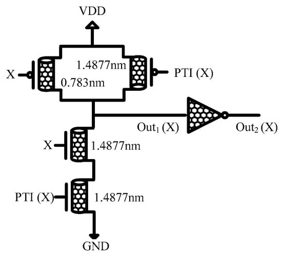 In this section, the proposed exact design of the ternary one-trit multiplier is described. First of all, it is essential to mention that in the schematic design of all the proposed methods, is the output of the circuit, as shown in Figure 1. This circuit gets a ternary digit of as its input and produces and as binary outputs. is the negated of the that is utilized in the proposed methods. The truth table of these two outputs is illustrated in Table 2. Also, in the schematic of the circuits, the NTI and PTI are negative ternary inverter and positive ternary inverter, respectively, their functions are detailed in Table 2 [].