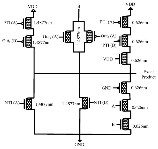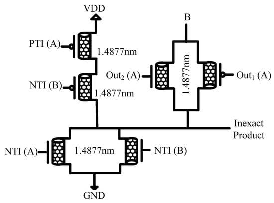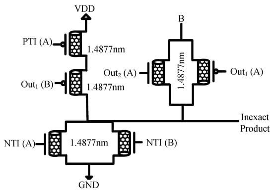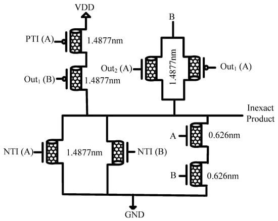 As we know, the product digit for the input digits of “22” is equal to “1” in the exact methods. Nevertheless, just like the first inexact method, the last part of the exact design is eliminated, which causes the product digit to be logically equal to “2” for this input combination. The schematic design of the second inexact method has been shown in Figure 6. The second method also considers the inexact carry output. In this design, the carry output digit would be equal to zero for all of the inputs. Hence, the circuit which generates the carry output is eliminated, and the carry output node is connected to the ground voltage to be equal to “0”.