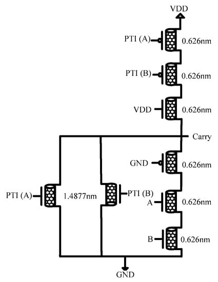 - Firouzi, S.; Tabrizchi, S.; Sharifi, F.; Badawy, A.H. High performance, variation-tolerant CNFET ternary full adder a process, voltage, and temperature variation-resilient design. Comput. Electr. Eng. 2019, 77, 205–216. [Google Scholar] [CrossRef]