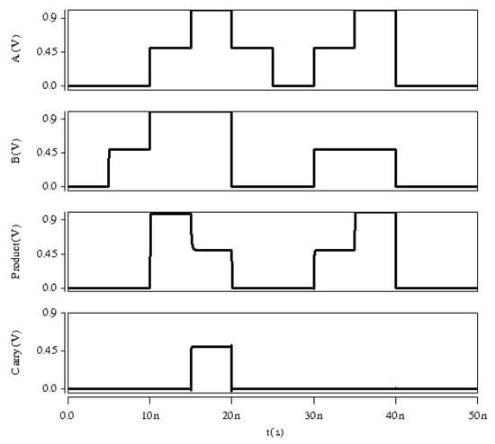 The schematic design of the exact product digit is shown in Figure 2. We can conclude from Figure 2, and the truth table of a one-trit multiplier shown in Table 1, for the first three input combinations, only the leftmost NFET of the pull-down network will be ON since NTI (A) would be logically equal to “2”. For the input conditions that the first input is equivalent to “1”, the middle transmission gate of the pull-up network turns on, and the second input reaches to the output node. If the input digits would be equal to “20” or “21”, the middle NFET of pull-down network and the two leftmost PFETs of the pull-up network will be activated, respectively. For the last input combination wherein both of the inputs are equal to “2”, the rightmost transistors turn on. In other words, for this condition, the product digit should be equal to “1”; hence, both of the pull-up and pull-down networks are active, and by a resistive division, the output becomes logically equal to “1”. The proposed design for the carry out digit has been illustrated in Figure 3 and its output is “0” for all input conditions except for the last input combination of Table 1. In this situation, the pull-up network and the rightmost NFET transistors of the pull-down network go ON, and the result would be equal to “” at the carry output node. The method for voltage dividing to produce “” at the output is more detailed in []. The transient responses of the proposed exact multiplier are shown in Figure 4, which confirms its correct operation.