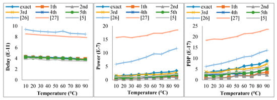 To asses the correct operation of the proposed methods and in comparison with previous state-of-the-art designs, all the methods are simulated for operational temperatures ranging from 0 °C to 90 °C at 200 MHz operational frequency and a 2 fF capacitor at output nodes. As Figure 8 shows, all of the proposed inexact methods benefit from lower delay and lower power consumption when compared to the previous exact multipliers.