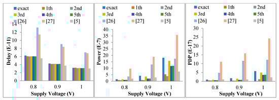 Figure 9 evaluates the correct operation of all circuits under various supply voltages. This figure represents the results at 200 MHz input frequency and a load capacitor of 2 fF. As anticipated, more supply voltages will result in more power consumption for all designs. The fifth proposed inexact design has almost 6X and 9X lower power consumption compared with designs of [] and [] at 0.9 V supply voltages, respectively.