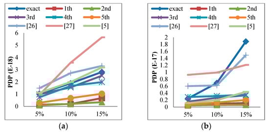 As we know, CNFETs have a large margin for process variations compared to MOSFETs. However, due to lithographic techniques and fabrication processes, they are prone to parametric variations such as variation in pitch value, number of tubes, or nanotube’s diameter []. Hence, designing a process-variation aware circuit is very important. The Monte Carlo simulation is conducted to identify the sensitivity of the proposed methods against diameter variation and density variation (pitch and number of tubes). The simulation of the proposed designs is conducted with up to under Gaussian distribution at . Figure 10 shows that the proposed methods are almost constant in PDP values by increasing the percentage of parameter variation compared to the existing designs. This is especially true for inexact designs. Present systems are more intricate and susceptible to failure, and therefore, designs that work correctly under process, voltage, and temperature variations are preferred.