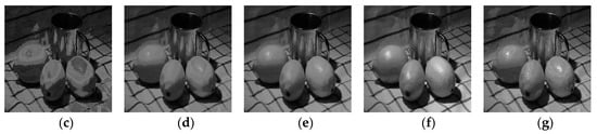 RGB to grayscale results. (a) Input image. (b) Exact output. (c) 1st design. (d) 2nd design. (e) 3rd design. (f) 4th design. (g) 5th design.