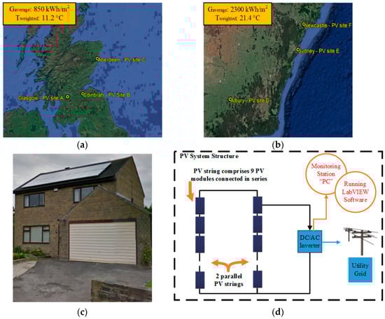 Examined photovoltaic (PV) systems: (a) geographical distribution of the examined PV systems located in the United Kingdom including the average irradiance and weighted temperature over the last 30 years; (b) geographical distribution of the examined PV systems located in the Australia including the average irradiance and weighted temperature over the last 30 years; (c) real picture of the examined PV system installed in Glasgow site—PV site A; (d) PV sites configurations, comprising two parallel PV strings, each consisting of nine series connected PV modules.
