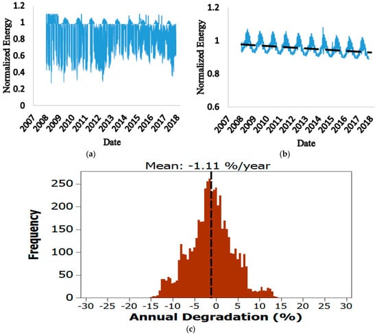 Normalized energy and annual degradation of the examined PV systems in the UK: (a) PV site A—Glasgow; (b) PV site B—Edinburgh; (c) PV site C—Aberdeen.