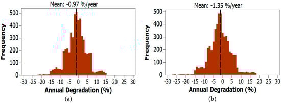 The YOY degradation analysis technique was applied to calculate the degradation rate of the examined PV systems based on their output dc power. Figure 3a–c shows the normalized output energy and the histogram of the degradation rate analysis in sites A, B, and C. Accordingly, in the Glasgow PV site, the mean degradation rate over the last 10 year is −1.05%/year. Grater degradation mean of −1.11%/year is observed for PV system installed in Edinburgh. Furthermore, the highest mean degradation rate is found in Aberdeen at −1.16%/year. Remarkably, this large degradation rate in the PV systems is related to the fact that the PV sites (A, B, and C) are in cold areas. The heavy snow, rain, and high wind speed impact the surface of the PV modules, thus there is a higher risk for PV hot spots, micro cracks, and damage in the surface of the PV modules due to hoarfrost, which subsequently will increase the degradation rate of the PV modules.