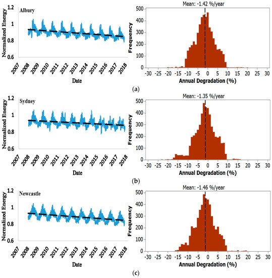 Similar to the previous section, the analysis of the degradation rate for the Australian sites has been conducted with the YOF degradation analysis technique. Figure 6a–c shows the normalized output energy and the histogram of the degradation rate analysis in sites D, E, and F. Consequently, in Albury PV site, the mean degradation rate over the last 10 year is −1.42%/year. A lesser degradation mean of −1.35%/year is observed for the PV system installed in Sydney. Furthermore, the highest mean degradation rate is found in Newcastle at −1.46%/year.