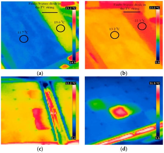 - PV modules bypass diodes failure: from the examined PV sites in Australia, it was found that several PV modules had a faulty bypass diode. Two examples are shown in Figure 7a,b. A faulty bypass diode is found in a PV string, resulting an increase in the PV string temperature. In Figure 7a, the PV string has 7.9 °C increase in the temperature, whereas the PV string in Figure 7b has 9.1 °C increase in the PV string temperature due to the bypass diodes failure.