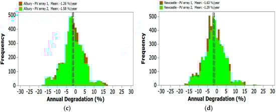Results shown in Figure 8c,d present the annual degradation rate for the sub-array in both Albury and Newcastle PV systems. According to Figure 8c, Albury PV site, the first PV array has an annual degradation rate of −1.26%/year. Whereas, the PV second PV array affected by faulty bypass diodes in two different PV modules has an annual degradation rate of −1.58%/year, resulting in a higher annual degradation due to the existence of the faulty bypass diodes. Similarly, Figure 8d shows the annual degradation rate in PV array 1 and 2 for PV systems located in Newcastle, Australia. The First PV array has high annual degradation of −1.63%/year because there are five PV modules are affected by various hot-spots. However, less annual degradation is obtained for the second PV array of −1.29%/year, while this PV array is only affected by one hot-spotted PV module.