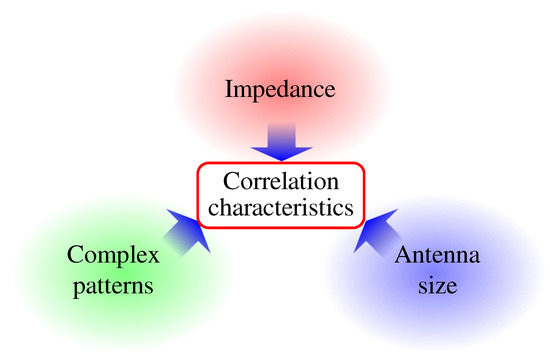 Figure 1 conceptualizes the impact of three key antenna factors (impedance, pattern, size) on the correlation characteristics. The impedance characteristics can be conditionally translated into the correlation characteristics [8]. In addition, the complex pattern is directly translated into the correlation characteristics [10], and it is well known that low correlation coefficients can be attained if the patterns or polarizations are orthogonal [15,16,17,18,19]. It is also empirically known that correlation increases when the array antenna is small [20].