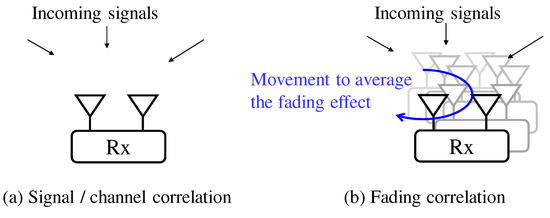 The correlation coefficients corresponding to Equations (11) and () are calculated by (between the m-th and n-th receiving antennas), (between the p-th and q-th transmitting antennas), respectively.