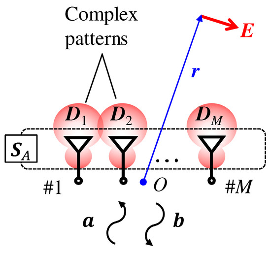 We now assume an antenna array whose S-parameter matrix is as shown in Figure 5. The signal, , incidents the feed ports of the antenna array. The reflected signal vector is expressed as . When the complex pattern of the m-th antenna element is expressed as , the observed field generated by this antenna array at a sufficiently distant point is expressed as