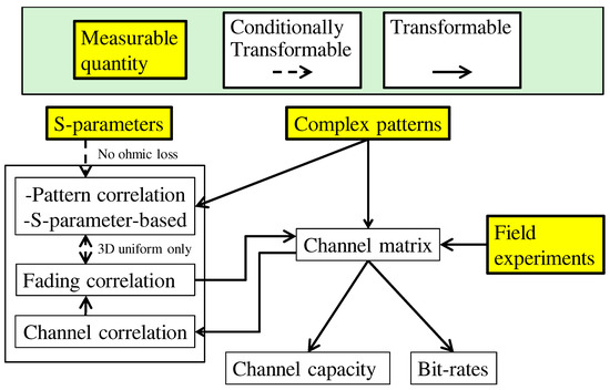 Figure 6 shows the relationship among the measurable and computable quantities through the correlation characteristics. The complex pattern is quite useful information because this can yield various kinds of the physical quantities that are used in MIMO systems. For example, the channel matrix is directly computed by combining the complex patterns and various kinds of channel models like GSCM. The complex ‘pattern correlation’ matrix can be computed from the complex patterns, and is identical to the ‘fading correlation’ matrix given the assumption of a 3D uniform environment. The ‘S-parameter-based’ correlation matrix is computed from the S-parameter matrix, and is identical to the complex pattern correlation matrix if the radiation efficiency of the antenna array is 100%. The fading correlation can yield the channel matrix by using a channel model like the Kronecker model. The instantaneous ‘channel correlation’ is directly calculated from the channel matrix, and the fading correlation is also computed again by averaging the instantaneous channel correlation over several hundreds or thousands of snapshots. Field experiments are effective in confirming the real channel matrix, but it is difficult to separate the antenna and environmental characteristics.