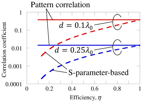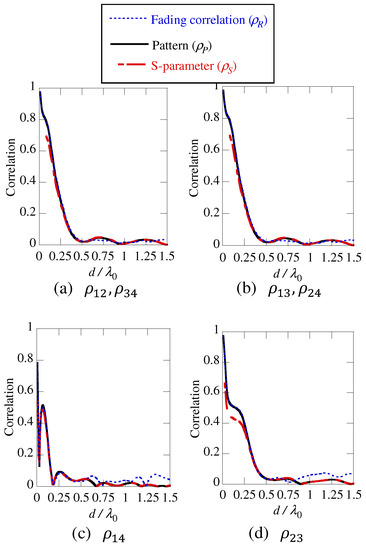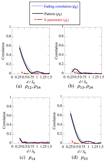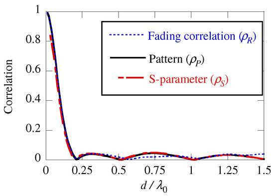 The fading correlation matrix is obtained by averaging the channel correlation matrix over the frequency band or locations of transmitting/receiving antennas (the relative position of the antenna in the antenna array must not be changed) in a certain environment [24,25,26]. Generally speaking, the term ‘spatial correlation matrix’ refers to this fading correlation matrix [24]. In addition, the fading correlation matrix is equal to the complex pattern correlation matrix only when the angular distribution of the departure and arrival paths are 3D uniform if the number of the paths is sufficiently large. The S-parameter correlation matrix is equal to the complex pattern correlation matrix if the Joule heat loss is zero [8], and also equal to the normalized fading correlation matrix with the 3D-uniform environment as described above.