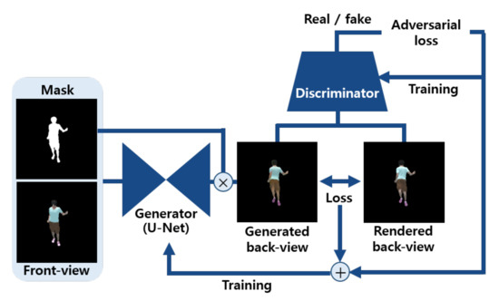 Realistic personalized avatars increase body ownership, presence, and dominance in virtual environments [1,2], so they can play an important role in social interactions as well as applications like virtual dressing rooms. To acquire a personalized avatar, photogrammetry scanners consisting of dozens of DSLR cameras can be used [1]. The scanners guarantee high fidelity but are demanding in terms of cost and space. Recently, methods based on convolutional neural networks (CNNs) have been proposed to create a personalized avatar from single front-view images of humans [3,4], reducing the cost and space as well as simplifying the capturing process. In [3], the texture of an avatar is obtained by generating the hidden back-view image from an input front-view image. Not only accurate but also realistic generation of the back-view image is essential because it determines the overall texture quality of the avatar.